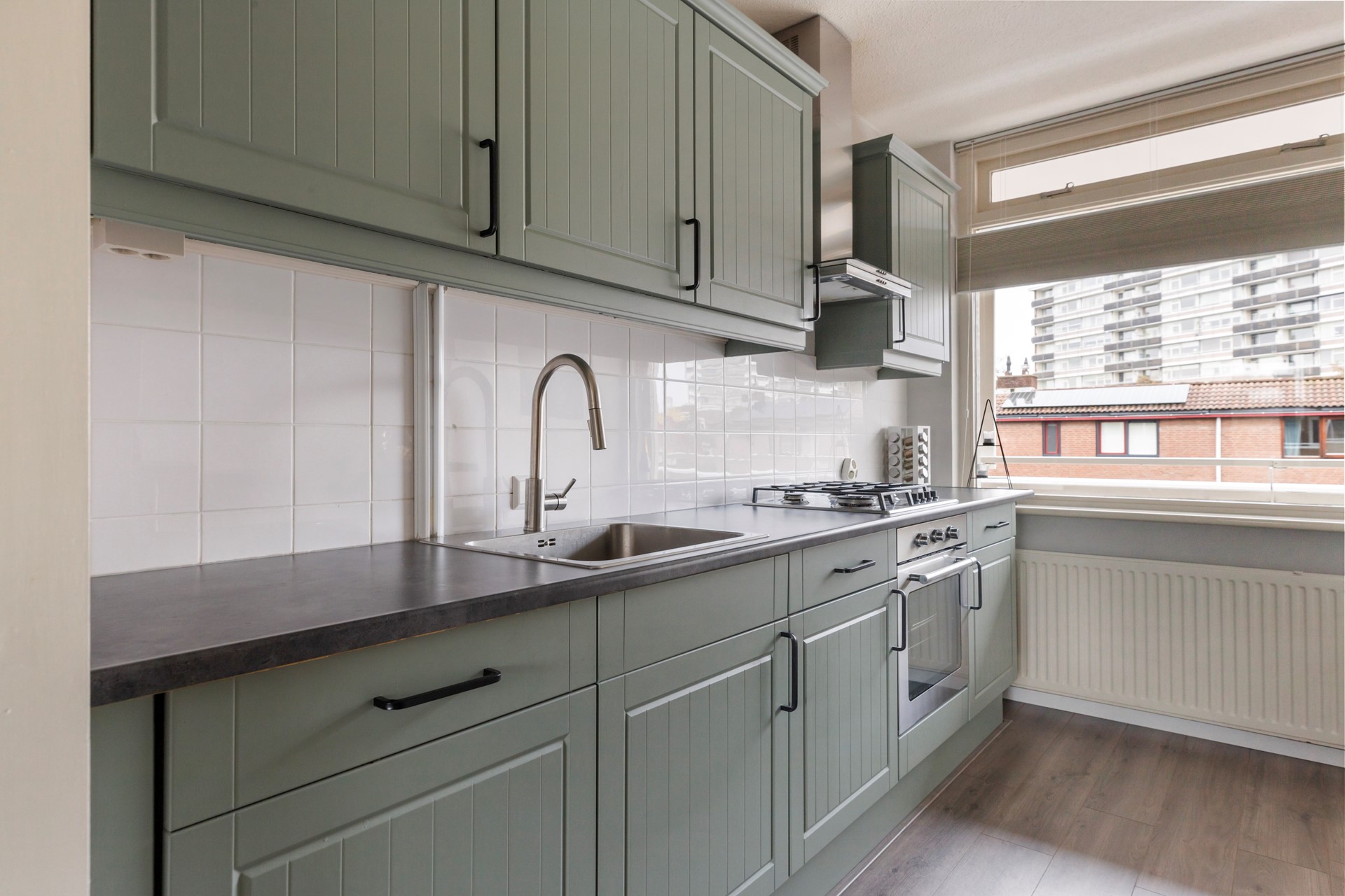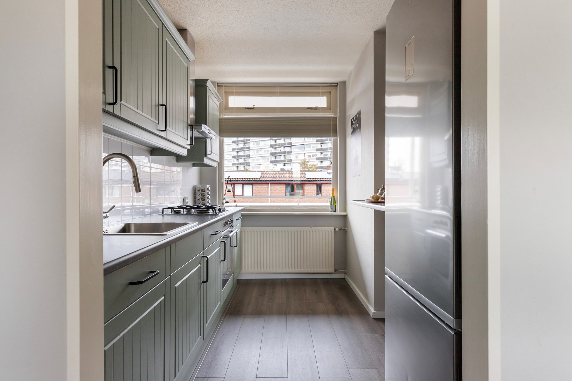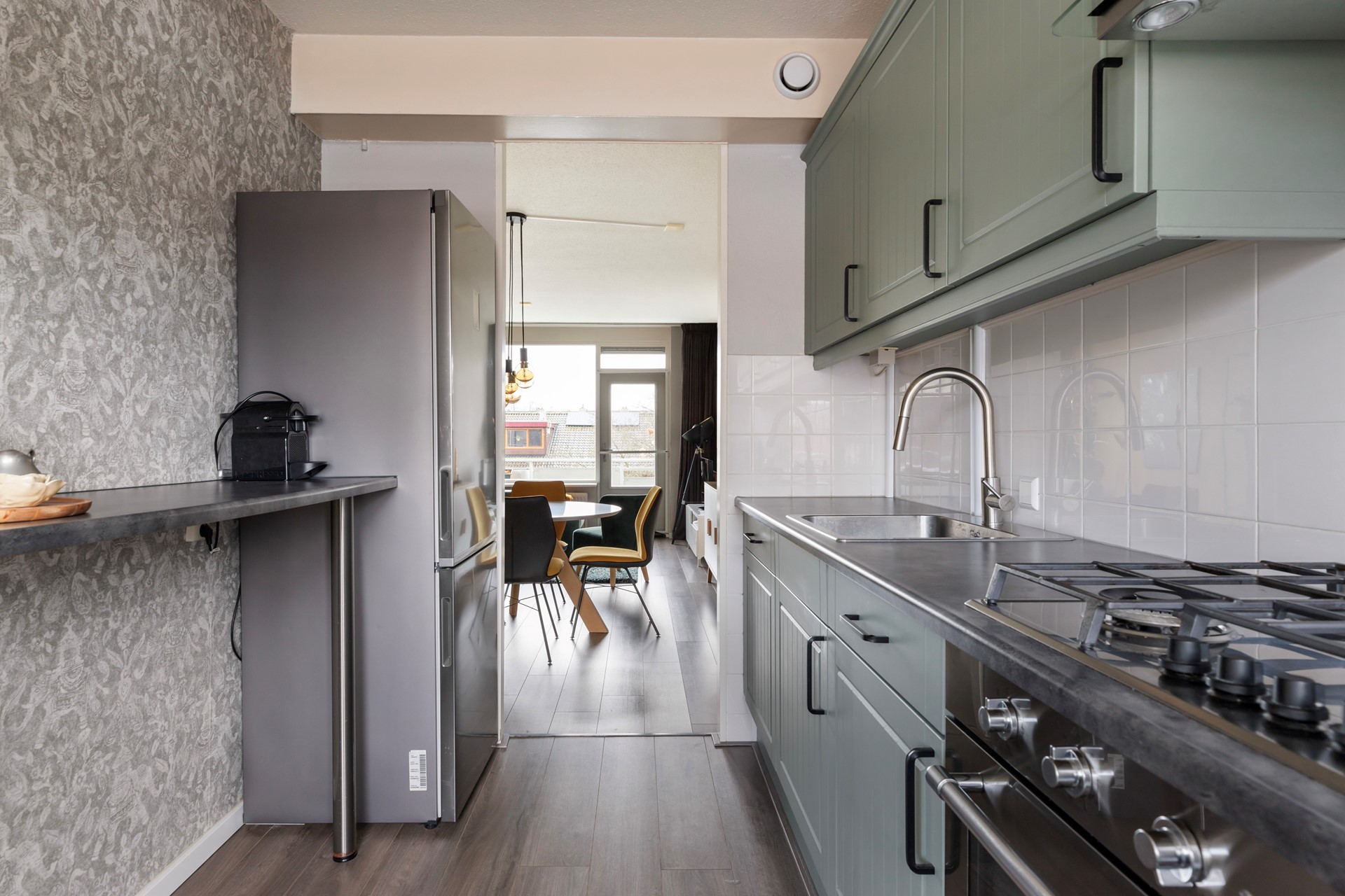 Aan de voorzijde ligt de halfopen keuken, uitgevoerd in een rechte opstelling met onder en bovenkasten. De keuken heeft in 2021 een nieuwe frisse kleur gekregen en is voorzien van een 4-pits gasfornuis, oven, rvs afzuigkap, vaatwasser (ca. 2019), vrijstaande koel-/vriescombinatie (blijft achter). Een fijne plek voor iedereen die graag kookt en geniet van een nette, verzorgde keuken.