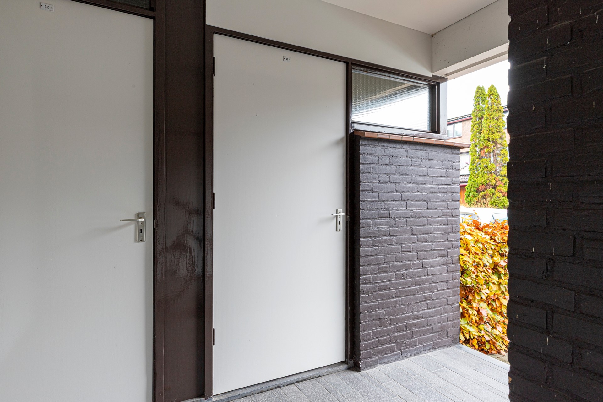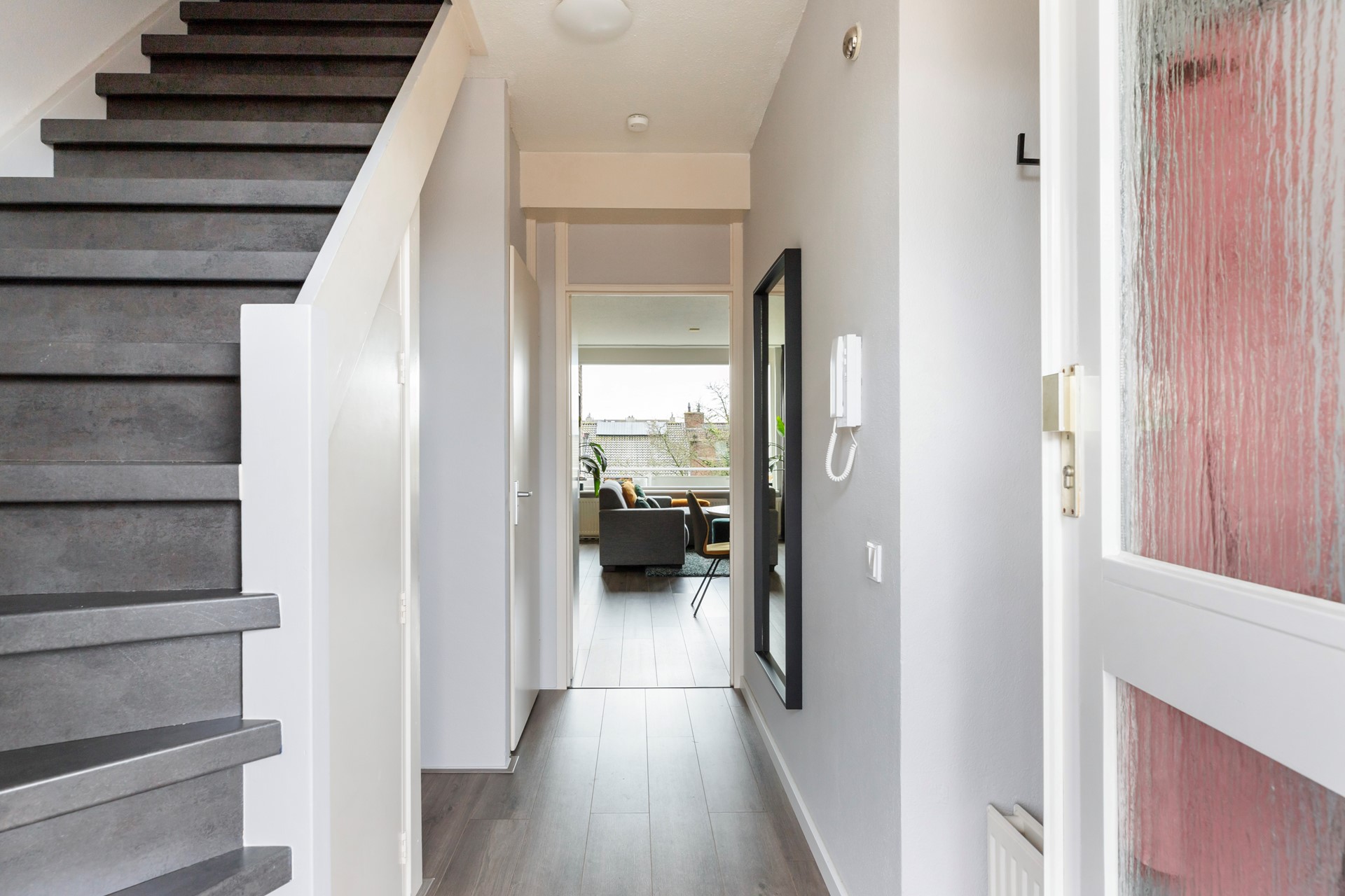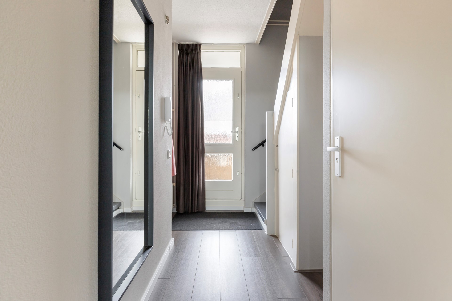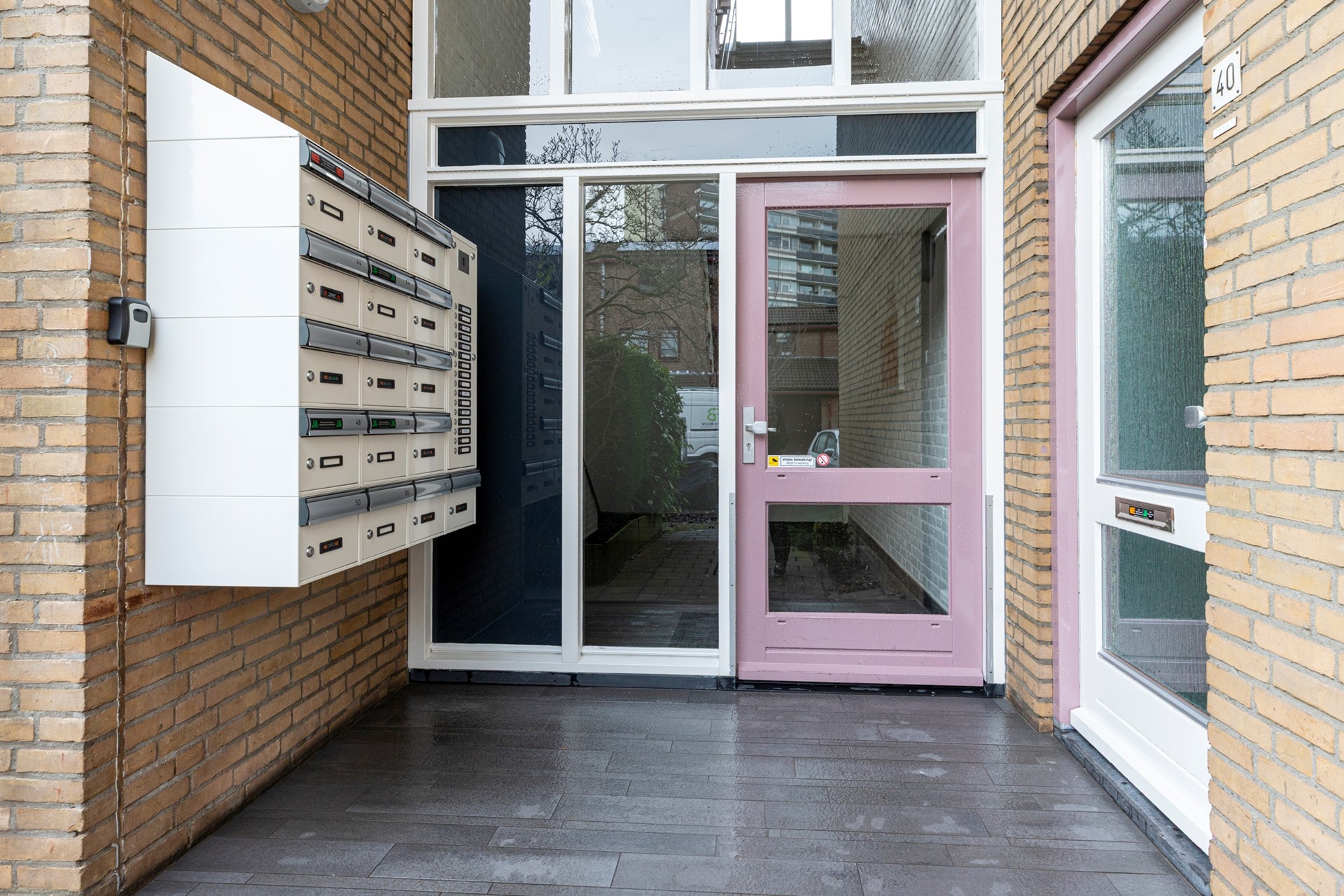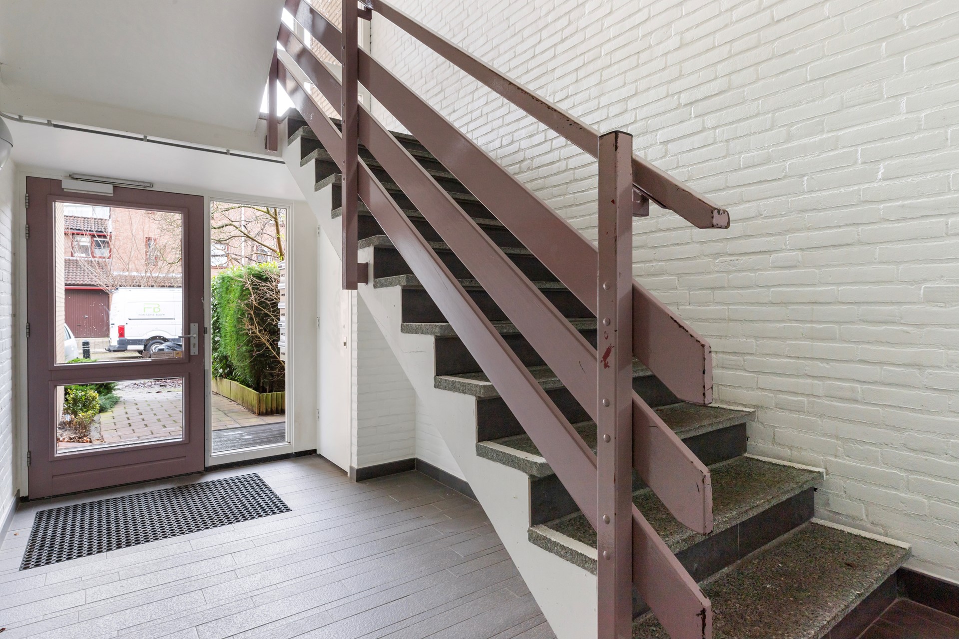 Gezamenlijke afgesloten entree met brievenbussen, bellenplateau en trapopgang.
