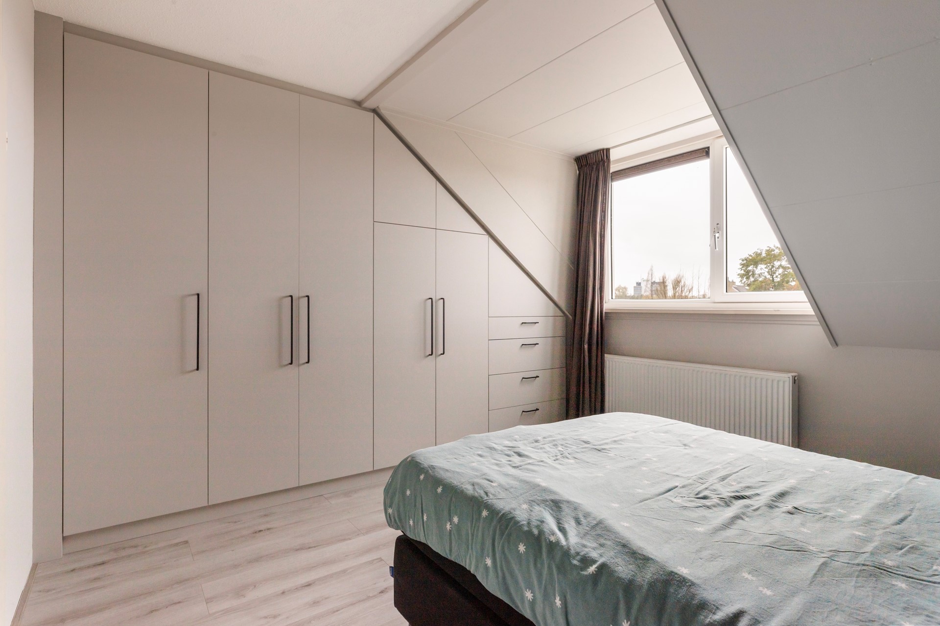 Aan de achterzijde ligt een zeer royale slaapkamer van circa 16 m², voorzien van een laminaatvloer en een kunststof dakkapel, waardoor de ruimte extra licht en ruimtelijk aanvoelt. Deze slaapkamer heeft over de gehele diepte een zeer fraaie, op maat gemaakte slaapkamerkast waar u heel veel in kwijt kunt!