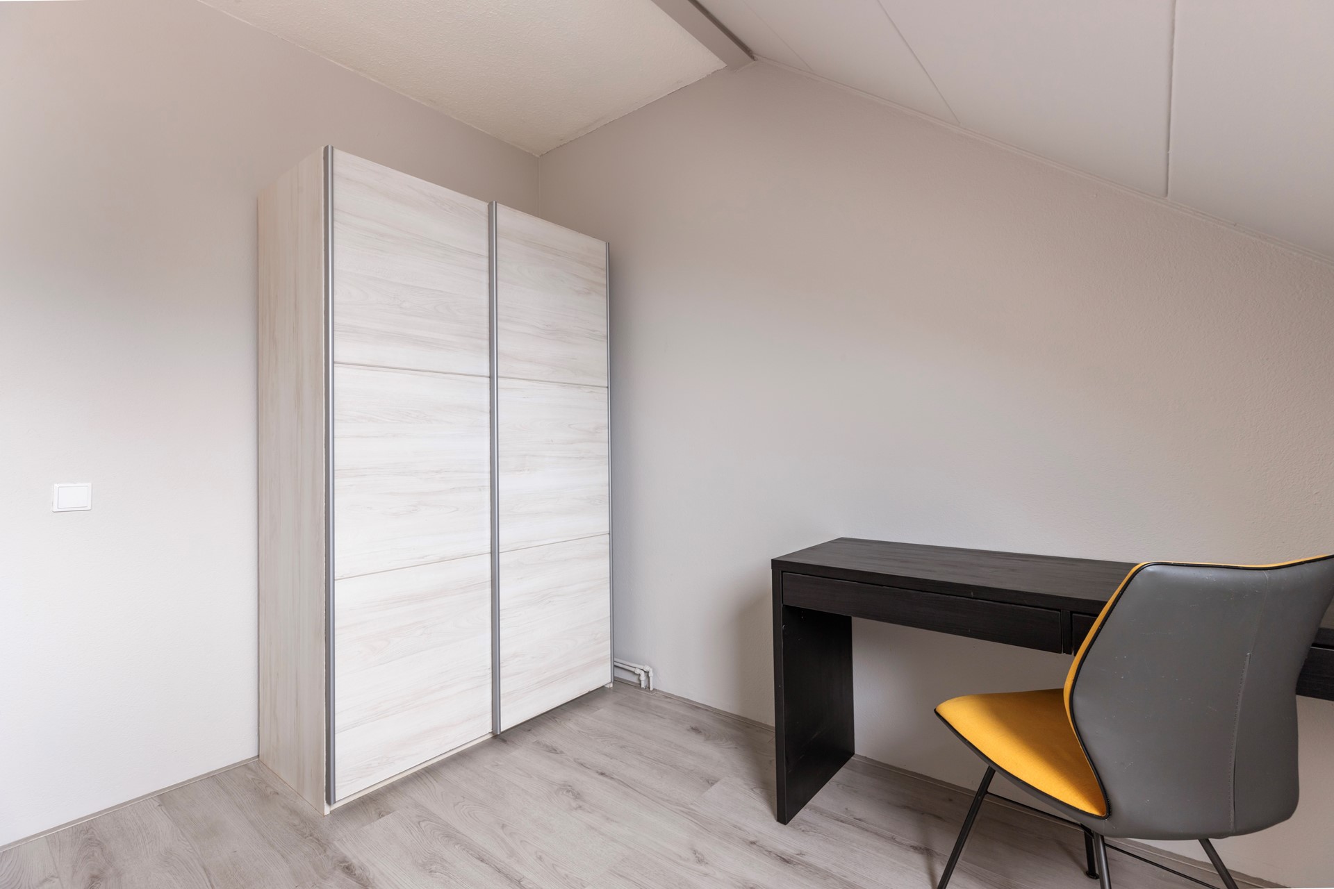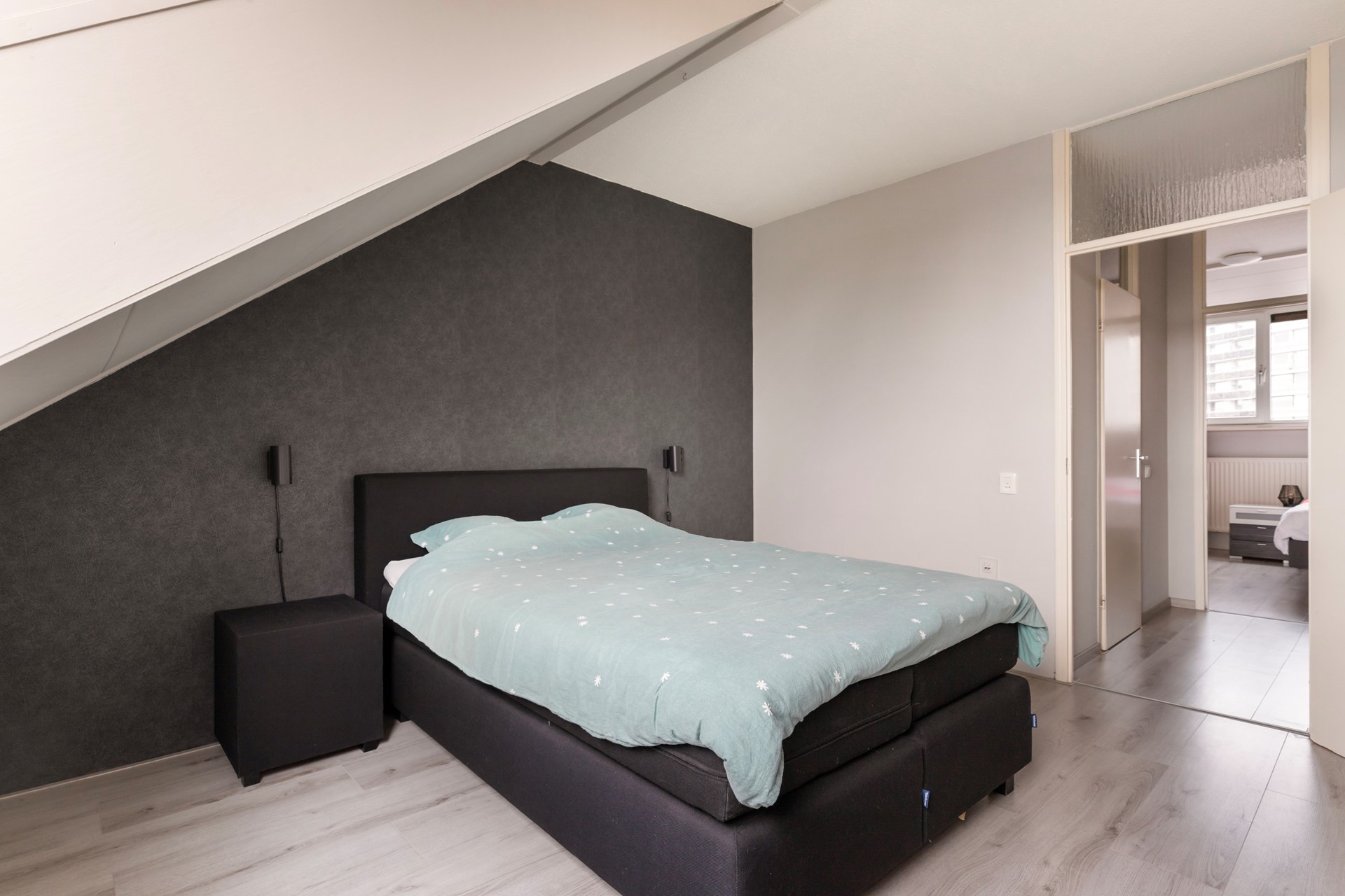 De tweede slaapkamer van circa 11,5 m² bevindt zich aan de voorzijde en is eveneens voorzien van een kunststof dakkapel en een nette laminaatvloer. Deze kamer is perfect te gebruiken als slaapkamer, werkkamer of kleedkamer.