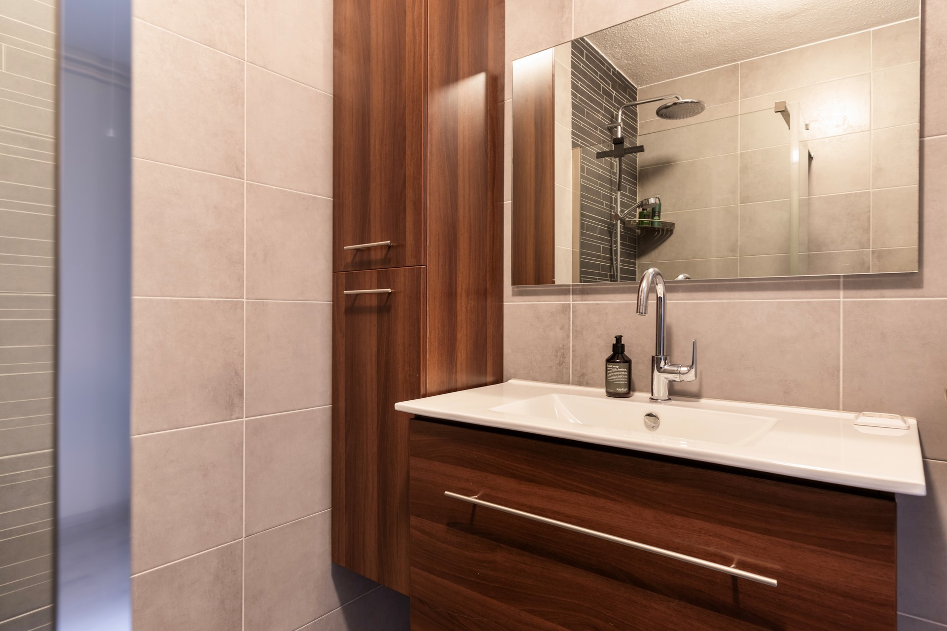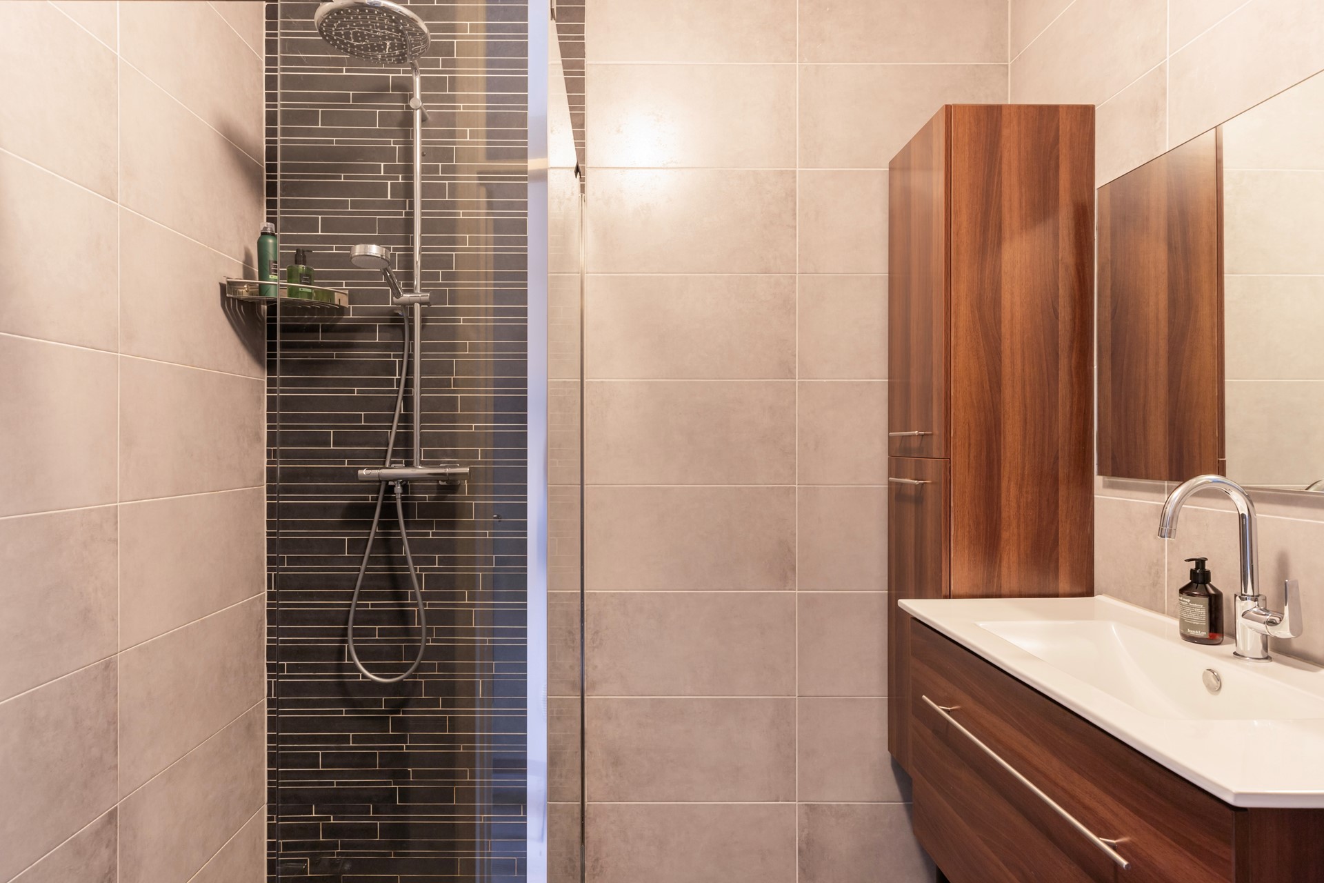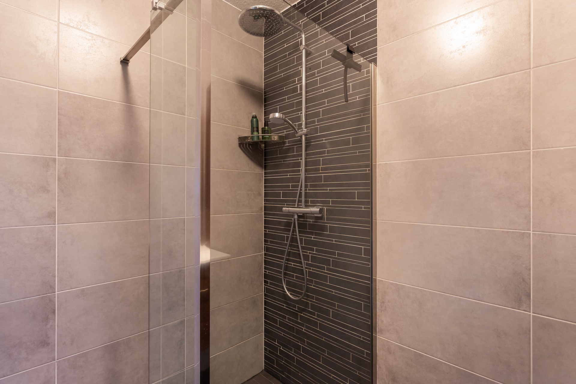 De moderne, volledig betegelde badkamer (2018) is uitgerust met een inloopdouche, wastafelmeubel met wastafel en een handdoekradiator. Een fijne, comfortabele ruimte om je dag ontspannen te beginnen of juist af te sluiten.
